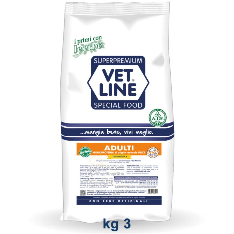 Composizione: Pesce 36% (di cui carne disidratata 28%, carne fresca 8%), patate, piselli, favino, olii e grassi, semi di lino (3%), polpa di barbabietola essiccata, riso, erbe officinali (0,5%) (Lino, Ortica folia, Tarassaco, Eleuterococco, Echinacea, Ginseng, Aglio), sostanze minerali.