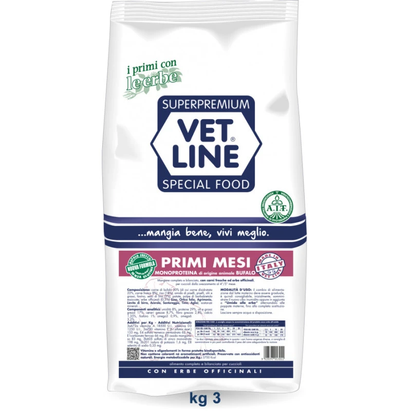 Composizione: Carne di bufalo 30% (di cui carne disidratata 22%, carne fresca 8%), riso (18%), amido di piselli, piselli, olii e grassi, favino, semi di lino (3%), patate, polpa di barbabietola essiccata, erbe officinali (0,5%) (Lino, Ortica Folia, Agrimonia, Lievito di birra, Acerola, Santoreggia, Timo, Aglio), sostanze minerali.